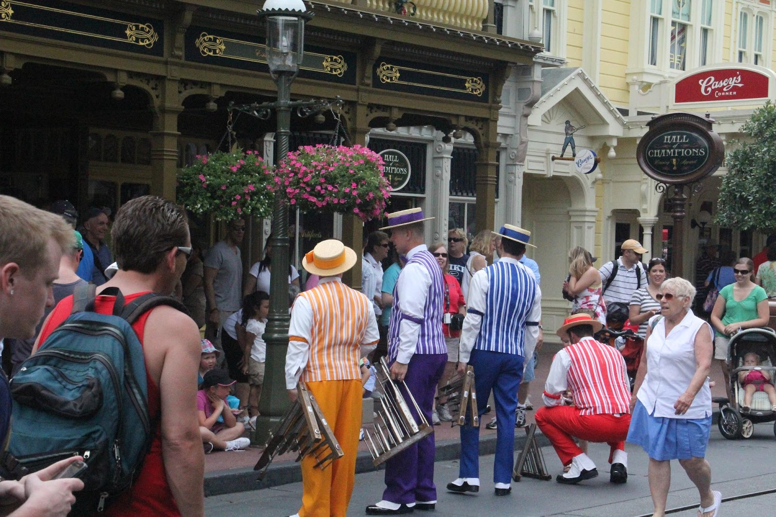 Dan zijn we er. Hoewel het al druk lijkt, zijn we toch snel door de security check en de toegangspoortjes. Een paar momenten later lopen we in Mainstreet en kan ik een 'wauw' niet onderdrukken. Wat ziet dit er geweldig uit! Wat een mooi uitzicht op het kasteel.