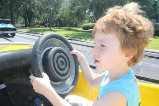 Vervolgens maken we een rondje in de 'Mad tea party' attractie; draaiende theekopjes. De kinderen vonden deze attractie erg leuk. Hoe harder we draaiden hoe leuker ze het vonden!Om de hoek bij de theekopjes zagen we de 'Tommorrowland speedway'. Peter heeft samen met Vincent een rondje gemaakt. Vincent mocht sturen. Hij vond het prachtig en na afloop was hij helemaal trots op zijn eerste drivers license.
